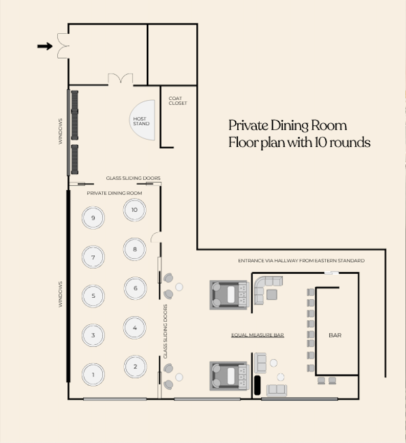Eastern Standard's Private Dining Room is a hidden gem, tucked within our cocktail bar, Equal Measure. Guests can easily reach it through a private walkway from Eastern Standard or by its own dedicated entrance on Beacon Street.